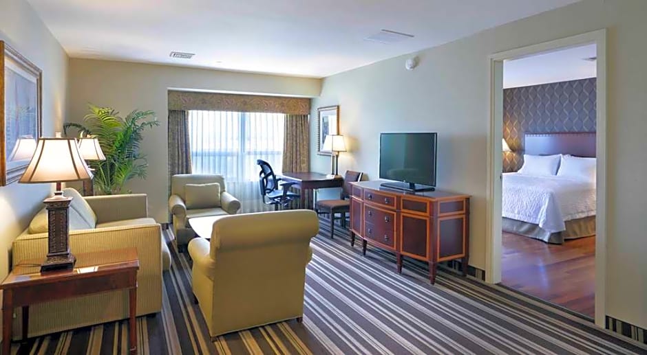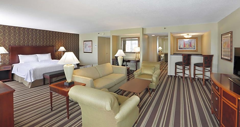 Living area, sofa bed, work area, free WiFi, tea/coffeemaker Settle into this two-room king suite and relax in the bedroom that features our clean and fresh Hampton bed®. The living area contains a plush sofa bed with a recliner or lounge chair, a TV and a tea/coffeemaker to help you feel at home. Stay productive at the spacious work desk and keep in touch with free WiFi. In the bathroom you'll enjoy fluffy towels, a WaterPik® showerhead and curved shower rod for added space and light.