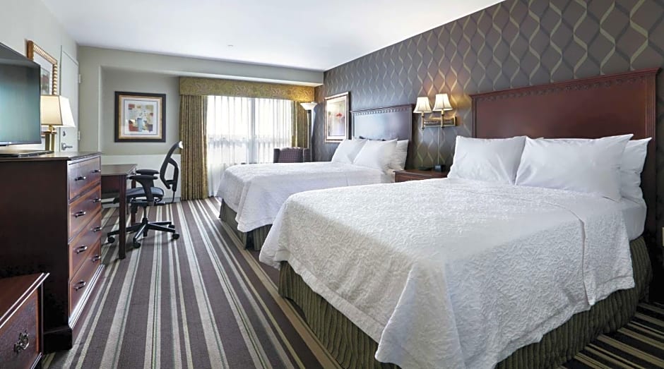 Work area, free WiFi, 32-inch TV, tea/coffeemaker Have a relaxing stay in this guest room that features 2 double, clean and fresh Hampton beds®. Watch your favorite show on the 32-inch TV and enjoy a delicious hot drink from your in-room tea/coffeemaker. The room includes a spacious work desk and free WiFi to let you catch up on work while traveling. In the bathroom you'll enjoy fluffy towels, a WaterPik® showerhead and curved shower rod for added space and light.