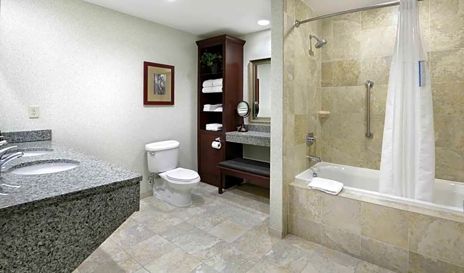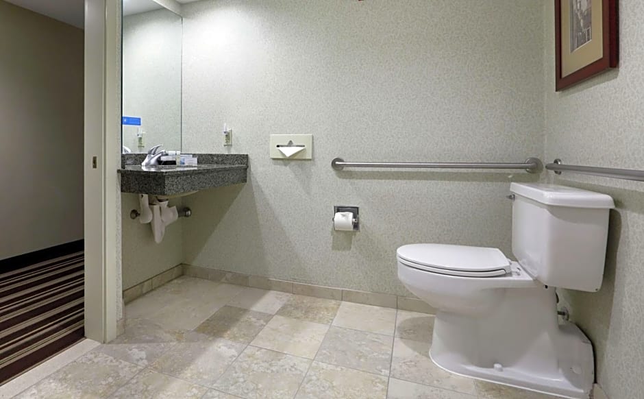 This mobility accessible, non-smoking room features one king-sized bed, and an accessible roll-in shower. The room features comfortable soft seating, a HDTV, and easy to operate alarm clock/radio. The free WiFi will help you stay connected while on the road. If you prefer not to work at the desk, you can use the convenient lapdesk instead. You'll also enjoy the convenience of having a coffeemaker with tea service and iron/ironing board in your room. Any corresponding photo may not reflect the specific accessible room type or room feature.