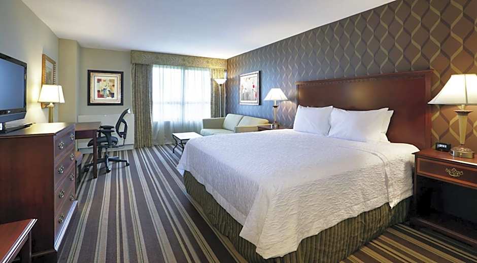 Sofa bed, work area, free WiFi, tea/coffeemaker Have a relaxing stay in this king room that features our clean and fresh Hampton bed®. Unwind on a plush sofa bed while watching your favorite show on TV. Enjoy a delicious hot drink from the in-room tea/coffeemaker. The room includes a spacious work desk and free WiFi to let you catch up on work while traveling. In the bathroom you'll enjoy fluffy towels, a WaterPik® showerhead and curved shower rod for added space and light.